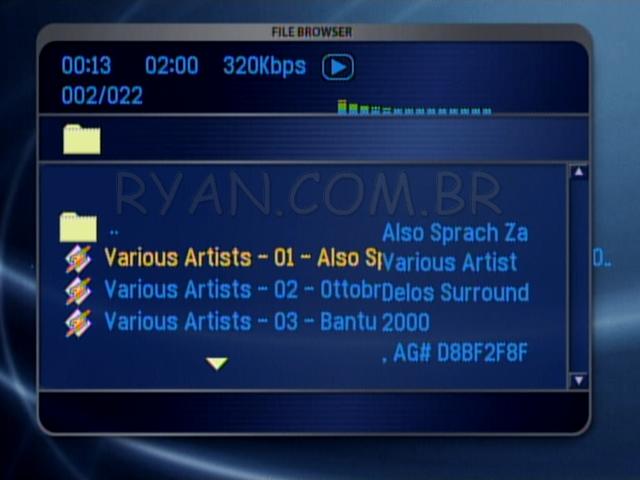 Quando um MP3 começa a ser executado, parte da tela é tomada pelas tags ID3. A divisão abrupta é um tanto deselegante, mas necessária para maximizar a quantidade de caracteres sendo exibidos.