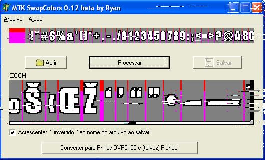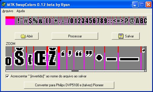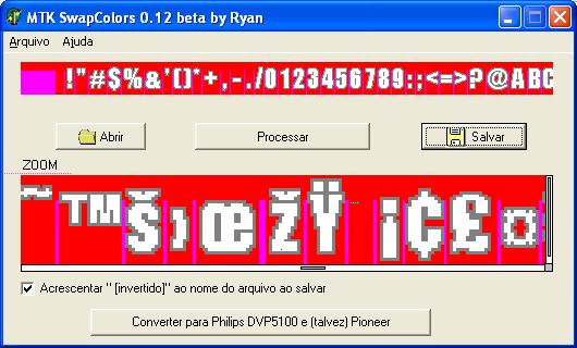 Passo 1.6 – Remover o fundoSe você está criando uma fonte de legendas (não se aplica ao browser) para um aparelho Philips, ainda há um passo a mais antes de salvar, se você quiser se livrar do fundo translúcido que a Philips coloca por trás da legenda. Para isso é necessária a versão 0.12 de mtkSwapColors. Clique no botão “Converter para Philips…”. A fonte deverá ficar parecida com isto: