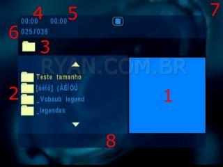 1) Esta área não é usada na navegação. É reservada para exibir o preview de fotos e as tags ID3 dos arquivos MP3, mas fica completamente vazia durante a navegação. No DVP642, é usada para mostrar subpastas e arquivos dentro da pasta atual.