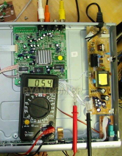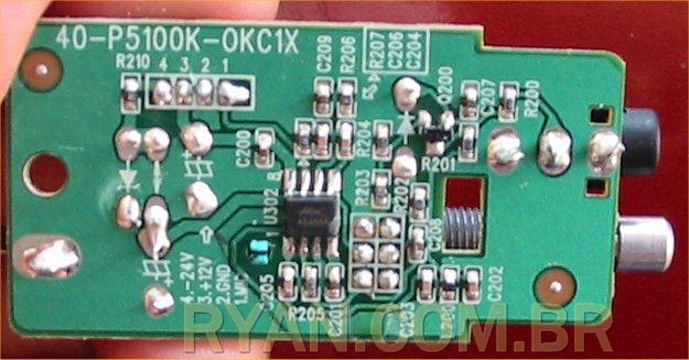 Close na fonte e circuito do microfone (karaokê). Assim como no DVP642, a placa de Karaokê tem um pequeno circuito SMD oculto sob ela.