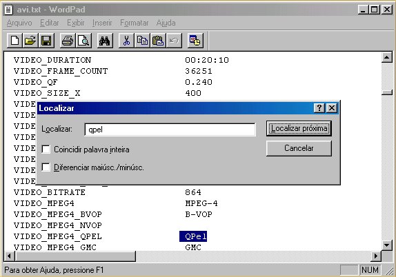 O GSPOT irá processar todos os AVIs da lista e você poderá acompanhar o processo visualmente. Quando tiver terminado, abra o arquivo resultante (definido lá no início) no Notepad ou no Wordpad. Para cada filme, deverá haver uma seção assim: FILE_NAME Muse - Apocalypse please live.avi FILE_NAME_WITH_PATH E:\Filmes\Muse - Apocalypse please live.avi FILE_SIZE 43,571,200 CONT_BASETYPE AVI(.AVI) CONT_SUBTYPE OpenDML (AVI v2.0), CONT_INTERLEAVE_TIME 40 CONT_INTERLEAVE_PRELOAD 470 CONT_INTERLEAVE_ALIGN Split CONT_TOTAL_BITRATE 0 CONT_BYTES_MISSING 0 CONT_AUDIO_STREAM_COUNT 1 VIDEO_CODEC_TYPE DX50/divx VIDEO_CODEC_NAME DivX 5.0 VIDEO_CODEC_STATUS Codec(s) are Installed VIDEO_DURATION 00:04:41 VIDEO_FRAME_COUNT 7037 VIDEO_QF 0.176 VIDEO_SIZE_X 560 VIDEO_SIZE_Y 448 VIDEO_DISPLAY_SIZE_X VIDEO_DISPLAY_SIZE_Y VIDEO_ASPECT_DECIMAL VIDEO_ASPECT_FRAC VIDEO_PICS_PER_SEC 25.000 VIDEO_FRAMES_PER_SEC 25.000 VIDEO_FIELDS_PER_SEC VIDEO_BITRATE 1105 VIDEO_MPEG4 MPEG-4 VIDEO_MPEG4_BVOP VIDEO_MPEG4_NVOP VIDEO_MPEG4_QPEL VIDEO_MPEG4_GMC VIDEO_H264 VIDEO_SAR VIDEO_DAR 1.250 VIDEO_MPEG2 VIDEO_MPEG2_I_L VIDEO_MPEG2_PROG VIDEO_MPEG2_TFF VIDEO_MPEG2_BFF O fime do exemplo acima não tem QPEL nem GMC. Você pode dar uma olhada no arquivo procurando pelo que quiser, mas para ir direto ao ponto, use o comando Localizar do Notepad ou Wordpad. Por exemplo, para encontrar um filme com QPEL, procure por " qpel" Sim, tem que colocar um espaço no início para você não ter que parar em toda a ocorrência do termo "VIDEO_MPEG4_QPEL" (uma para cada filme). Colocando o espaço, voce só vai achar os filmes que realmente tem QPEL. No exemplo abaixo, encontrei de cara um filme com QPEL e GMC: