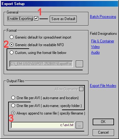 Enquanto essas capacidades não são adicionadas, eu desenvolvi um método para que você possa verificar que AVIs, num HD inteiro, tem GMC ou QPEL, sem muita complicação e mais ou menos rápido :) O processo é bem simples. O passo-a-passo aqui faz com que pareça complexo, mas você verá que não é. Você precisa da versão 2.52 b01 do GSPOT. Versões diferentes podem não ter o que precisamos. Primeiro, habilite a exportação dos resultados do GSPOT para arquivo indo em OPTIONS-EXPORT (se você tiver uma tela diferente da seguinte, está com a versão errada do GSPOT):