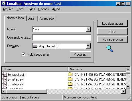 O GSPOT está pronto. Deixe-o aberto e vá procurar os filmes. A dica é usar o comando Localizar (Pesquisar, no XP) do Windows para preparar uma lista de todos os seus AVIs. Abra o Localizar e peça para procurar por *.AVI no diretório ou HD onde estão os seus filmes: