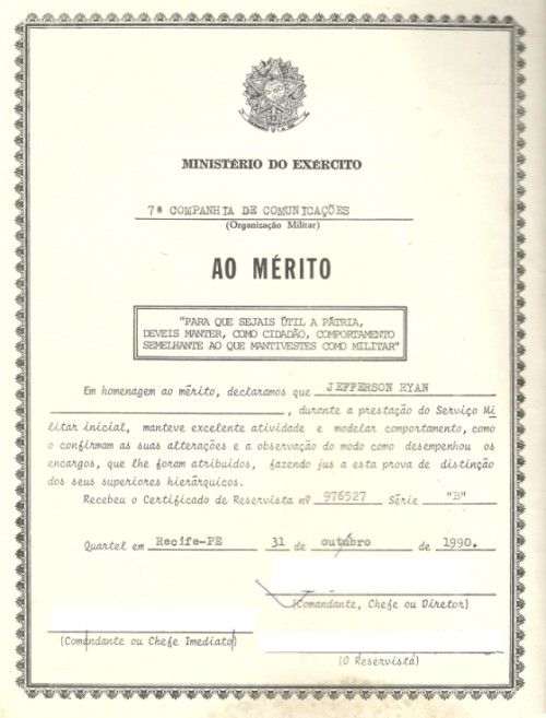 E levando em conta que eu estava lá contra a minha vontade, que eu dizia isso para todo mundo que me perguntasse incluindo meus superiores e que para mim era um castigo por ter sido tolo, fiquei surpreso ao receber isso junto com o certificado de reservista ao finalmente conseguir minha liberdade de volta.