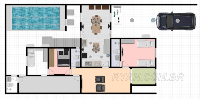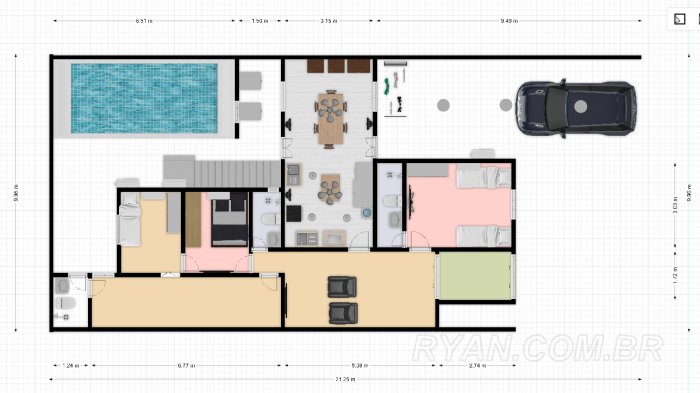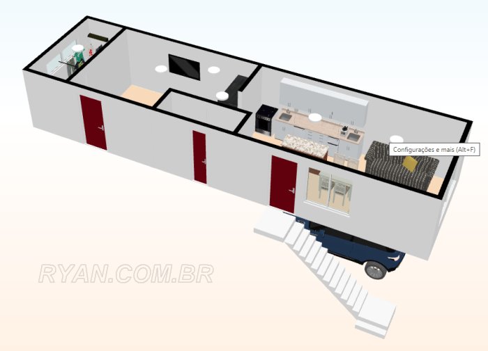 • Você pode editar as dimensões dos móveis para as dimensões exatas dos seus. E definir a altura de instalação para posicionar com precisão itens que estão presos na parede ou sobre outros móveis. Você pode até inserir alturas negativas para posicionar objetos sob o andar onde você está trabalhando. Eu usei essa capacidade para poder contornar de forma limitada a incapacidade da conta gratuita de trabalhar com mais de um andar. No exemplo abaixo o carro e a escada foram inseridos com “raise from floor” negativos.