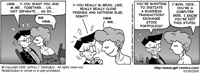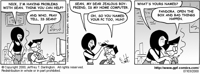 Não, eu não estou falando do malfadado erro que até o Windows 9x causava o colapso total do SO. General Protection Fault é também o nome de uma webcomic de acesso gratuito sobre geeks/nerds que existe desde 1998. Eu ainda estou lendo as tiras de 2001, mas gostei da maior parte do que vi até agora.