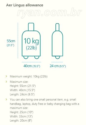 As regras da Aer Lingus eram: na cabine uma mala de até 10kg e 55 x 40 x 24 e mais um objeto pessoal como um notebook com no máximo 25 x 33 x 20. E nenhuma bagagem de porão.